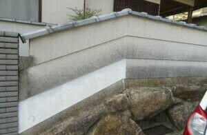 外塀を石材調セラミックで施工されておられましたが、劣化によりぽろぽろ剥がれておられました。 セラミック塗装は膜厚が大きいため、剥離部分を除去すると段差が生じます。 |