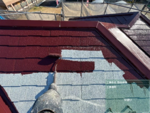 釘頭にシール補修を行った後、屋根の塗装を下塗り、中塗り、上塗りと進めます。