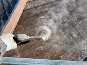 屋根の塗装についても高圧洗浄で藻、コケなど汚れをしっかりおとす作業から始めます。
