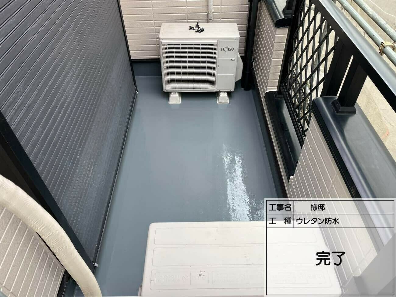 グレーの仕上げ色が清潔感を与え、雨水がスムーズに流れるよう勾配も確認・調整しています。これにより、ベランダの防水性が格段に向上しました。