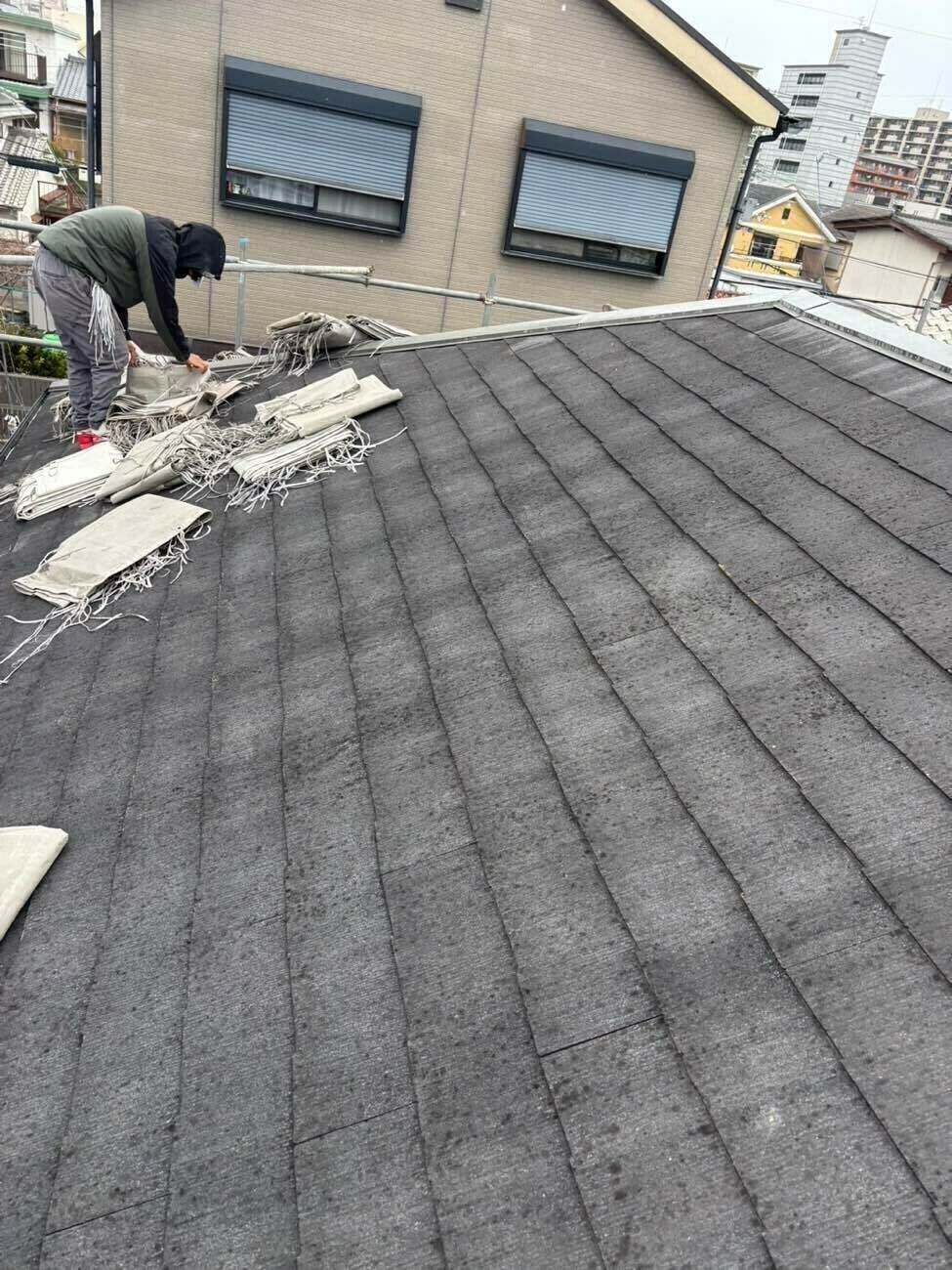 屋根はカラーベスト材で、経年劣化による色あせや表面の細かなひび割れが見られました。