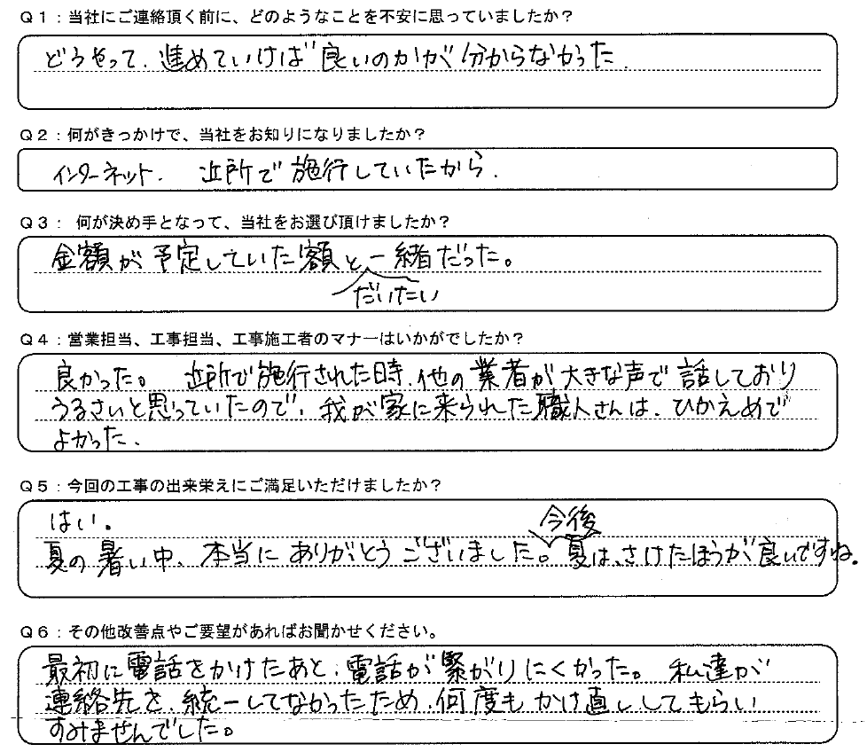 地域で実績を積んでおられる事。こちらの些細な疑問に適格に答えて頂いた事。他社での見積もりに含まれていた費用が抑えられ、その分塗料の質を上げられた事。