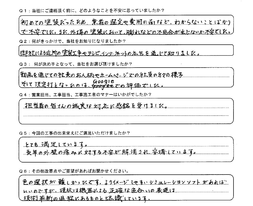 長年の外壁の痛みに対する不安が解消され安堵しています
