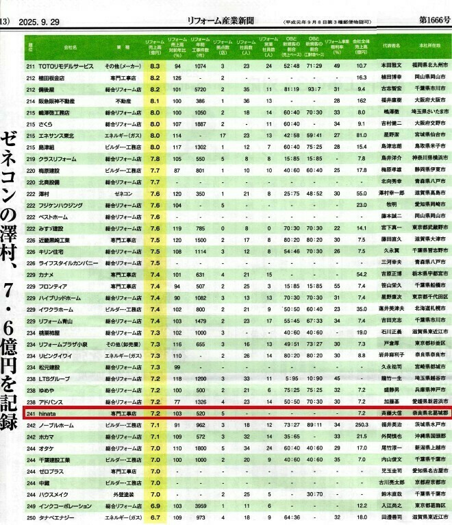 本日は、2025年に発表されたリフォーム産業新聞の売上高ランキングについて、ひなたペイントの実績をご紹介します。